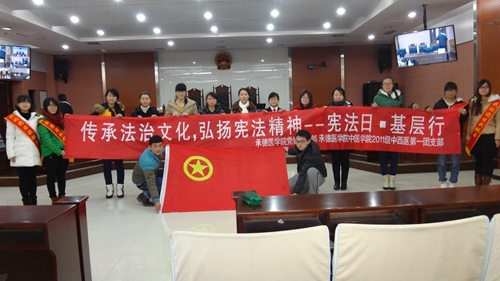 党的十八届四中全会通过的《关于全面推进依法治国若干重大问题的决定》提出,在全社会普遍开展宪法教育,弘扬宪法精神,并将每年12月4日定为国家宪法日。为贯彻落实党的十八届四中全会精神,学习、弘扬宪法精神,进一步激发大学生爱国爱党、奉献社会的情感,我校党委宣传部与中医学院2011级中西医第一团支部于2014年12月4日共同开展了主题为“传承法治文化 弘扬宪法精神―宪法日・基层行”的团日活动。 2014年12月4日上午,团支部成员到承德市中级人民法院,旁听了一起公开审理的民事案件。庭审正式开始,审判长宣布法庭纪律、合议庭人员组成、核对当事人、询问是否申请回避、是否申请不公开审理、原告宣读起诉状、被告宣读答辩状、审判长归纳争议焦点、原被告双方按照法庭归纳的争议焦点依次进行举证质证、询问双方对事实部分有无补充、双方进行辩论、征求双方最后意见,进行法庭调解、合议庭评议、宣判、告诉当事人的上诉期限、闭庭。整个过程一气呵成,干净利索,体现出了审判人员精湛业务能力和纯熟的技术水平。庭审结束后,团支部成员在中院宣传处钱丽艳老师的带领下,参观了中级人民法院的文化长廊,了解了法律的形成与发展,经过钱老师的讲解,团支部成员对目前中国法律的现状以及宪法相关知识有了更加深刻的认识。 该日下午,团支部成员分成4组,分别在承德市中心广场、火车站、汽车东站、承德市实验小学发放宣传单,宣传《中华人民共和国未成年人保护法》和《中华人民共和国宪法》,为市民、小学生讲解相关知识,并与他们交流了上午旁听庭审的感受。活动反响良好,得到了承德市电视台的报道。 通过此次活动,团支部成员增强了法律意识,提高了社会责任感。团支部成员们纷纷表示感受到了法律的庄严与神圣,法律面前人人平等,作为社会主义的接班人应加强对法律的理解与学习,做一个知法、守法、护法的社会主义好公民。