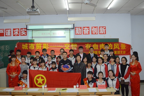 2015年11月16日至18日,为倡导团员们遵守交通规则,更深入地学习交通安全知识,基础医学院2014级康复团支部在承德市小南门、承德大桥、承德市交通管理培训所、我校教学楼410教室举办了以“城市剪影,有血肉的风景――直留正气冲霄汉,不言劳苦换安然”为主题的团日活动。承德市交通支队承德交警支队宣传部处长赵志新、科员王阔,河北交通电台小记者惠冠成、学生安全工作处老师杨济维、基础医学院2014级年级辅导员祁延伟出席了活动。基础医学院2014级康复团支部全体团员以及现场百余名观众参加了此次活动。 11月16日至17日,该团支部团员按照交警支队安排,分成两个执勤小分队,在承德市小南门以及承德大桥两个重点十字路口协助交警执勤,并在两个重点十字路口悬挂条幅,时刻提醒群众遵守交通规则。此外,部分团员随赵志新前往交通管理培训所,由主持人向在场观众介绍此次团日活动,随后,选派5名代表,以情景剧的形式为观众介绍了交通安全的重要性。18日下午,在教学楼教室410,该团支部开展了主题讲座活动。迎着鲜艳的团旗,伴着嘹亮的团歌,活动拉开了帷幕。随后赵志新现身说法,作为一名工作在一线多年的交通警察,他为团员们讲述了他的工作经历。一段段交通肇事视频,触目惊心。惠冠成表达了对当代交通的看法,呼吁全社会遵守交通法则,希望人人安全出行。团员代表刘茜瑶发表感言,表示学习到了更多的交通安全知识,提高了团员们的交通安全意识,并代表团员们表明了遵守交通法则的决心,团员代表李阳向赵志新献花表达对交警的崇敬之情。最后祁延伟对活动进行了全面、深刻的总结。 经过此次活动,团员们对交通安全有了全新的认识,提高了自己的交通安全意识,在远离“中国式”马路的行动中将起到带头作用,为更好地学习和践行核心主义价值观,营造和谐的交通氛围起到积极的推动作用。