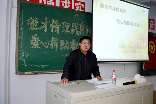 2015年11月18日下午,临床学院2012级临本第十一团支部举办主题为“德才情理践真经 爱心捐助救患童”的团日活动。校党委宣传统战部部长于多珠、生物医学工程系直属党支部书记许士奇,以及临床学院辅导员老师和受助患童母亲乔立云出席了本次活动。 于昕硕是来自承德市隆化县韩家店乡韩家店一名年仅4岁却身患脊髓灰质炎导致下肢瘫痪的小男孩,本来一直在附属医院进行治疗的他,却因为家境贫寒支付不起高昂的医疗费不得不出院回家,但他所就诊的康复科的医护人员都很心疼小昕硕,于是便与我校许士奇书记联系,希望能借助大家的力量还小昕硕一片蔚蓝的明天。生物医学工程系的同学在接到消息后第一时间通过微信平台将募捐活动推送出去,与此同时,临床学院2012级临本第十一团支部的同学也注意到了这个令人痛惜的事情。团支部成员第一时间召开班委会,拟定活动计划,并于11月14日在中心广场进行了大范围募捐活动,即便天气寒冷,但是没能阻挡大家的热情。截止到18日,共筹集募捐资金10195.4元,联合生物医学工程系同学在校内师生中募捐的3000多元一同交到了于妈妈手中。此次活动在《承德晚报》头版头条刊登,希望他们的善举能被更多的市民回应。 为了给同学们一个正确的思想引导,第十一团支部成员还邀请于多珠部长给大家进行了一场关于“如何做好一名合格青年”的主题团课。于多珠勉励在场的青年学子要迈好人生的第一步,努力将“勤学、修德、明辨、笃实”这八字真经融会贯通,铭记于胸,付诸于行,用青春的臂膀扛起时代的重任,用青春的面庞装点祖国的容颜,用青春的笔触书写壮美的诗行。“雷锋精神,人人可学;奉献爱心,处处可为;积小善为大善,善莫大焉”。对于此次募捐活动,于部长引用了上述习总书记给郭明义爱心团队回信中的一句来表示他内心深处的认可和支持,他希望青年学子们能将善意之举传承下去,使它能够感染更多的同学,为校园精神文明的建设增砖添瓦。最后,于部长用习近平总书记的“十六字诀”――“志存高远、德才并重、情理兼修、勇于开拓”结束了讲课,他祝愿每一位青年学子能在火热的青春中放飞人生梦想,在拼搏的青春中成就事业的华章。 生命的可贵在于身边有爱的人,有了爱就有了希望。在社会的大湍流下,每时每刻都上演着不同的故事,只有当每个人都保持一颗善良的心,社会才会变得和谐。为于昕硕募捐的活动没有结束,因为还有无数个于昕硕等待着大家的援助。