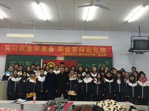 2015年11月20日下午,护理学院2012级本科第一团支部在教学楼212教室举办“实习就业早准备 毕业答辩我先知”主题团日活动。高等医学教育研究室主任王岩、护理学院党总支副书记田建丽以及护理学院100余名学生参加。 伴随着激扬团歌,鲜艳的团旗徐徐展开,团日活动拉开帷幕。首先,田建丽以幻灯片放映的方式讲解了关于“面试、实习、毕业、考研、就业”等方面问题,讲解过程中师生热情互动,在问答中田书记解决了学生诸多困惑,学生学到了具体而生动的面试技巧、正确的择业观,树立了积极向上的青春理想。随后,王岩就同学们提出的相关问题给予更具体的解答和概括性的总结。活动气氛热烈,同学们学有所获,最后,团日活动在师生讨论与交流声中落下帷幕。 面对即将到来的实习生活和就业选择,护理学院2012级本科第一团支部从自身实际出发,实事求是解决问题,不仅拓宽了眼界,丰富了知识,更从本次团日活动中清楚辨析了就业方向,树立了正确的人生观和价值观,为践行社会主义核心价值观打下了扎实的基础。