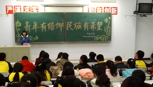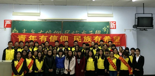 2015年10月26日到30日,为宣传贯彻习近平总书记系列讲话精神,中医学院2013级中医班团支部开展了主题为“青年有信仰 民族有希望”系列团日活动。中医学院辅导员刘慧,针灸推拿教研室老师辛思源、中医教研室老师熊鑫出席了此次活动。 该团支部成员采访了包括校学生会、社团联合会、篮球队、军乐队、舞蹈社等多个校园组织与社团负责人,各大组织都坚定信仰并在学习、工作和生活中积极践行,在微博上参与了话题为“青年有信仰,民族有希望”的信仰接力活动。10月28日下午,全体团员在教学楼102教室观看了《信仰,我们的故事》的历史文献纪录片,观后团员们积极撰写了心得体会,该团支部组织了交流会分享信仰,互相督促,共同践行。11月5日下午,该团支部在教学楼212教室举办了主题讲座活动。承德好人、河北省优秀志愿者、全国“五一”巾帼标兵栾金颖与团员们分享了她的事迹,在平凡的岗位上做着不平凡的工作。她把患者当亲人,她是当代社会主义核心价值观的真正的践行者。暑期赴宁夏沙沟的医学院学生郭艳玲的支教事迹也让团员们感触颇深,团员们立志坚定信仰,为社会多做贡献。 通过此次活动,团员青年们了解了中华民族的伟大复兴要靠全民族的坚实信仰来支撑和推动,青年有信仰,民族有希望,国家有力量,并自觉将社会主义核心价值观落细落小落实,入脑入心,积极践行,内化于心,外化于形,早日实现中国梦。