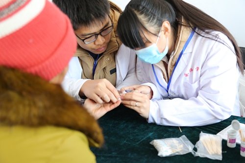 校学生会志愿者在为村民检查身体