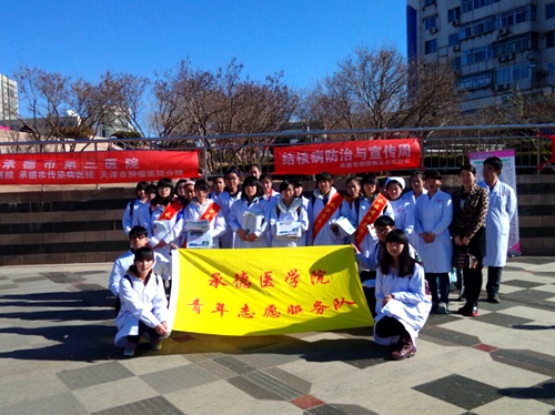 2015年3月19日、26日,为学习践行雷锋精神,服务有困难的群体,基础医学院2014级影本第二志愿者服务队到承德市社会福利院照看孤残儿童,并且于3月21日在中心广场与疾控中心、市第三医院进行防治结核病宣传。 活动期间,有先后两批志愿者去承德市社会福利院献爱心,陪孤残儿童玩耍,给他们带去欢乐,用实际行动传承雷锋精神。通过与疾控中心和市第三医院合作,在中心广场进行防治结核病宣传,志愿者实现了将雷锋精神融入医学生生活的使命。3月21日,志愿者在广场发放宣传报纸,并向市民讲解相关内容,大家的热情吸引来大量市民的咨询问诊,达到了活动的预期效果。通过近期参与此系列活动,志愿者将关爱他人,预防疾病作为自己的责任,并把志愿者服务精神贯彻其中。此次活动受到了市民的大力支持与肯定,同时被承德市电视台健康栏目报道。 此次志愿者活动的举办,不仅给福利院的孩子们送去了温暖,还给市民献上了防治传染病的科学方法,使同学们在奉献爱心的同时传承了志愿者服务理念,并进一步弘扬了雷锋精神。