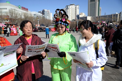 志愿者在广场发放宣传报纸,并向市民讲解相关内容