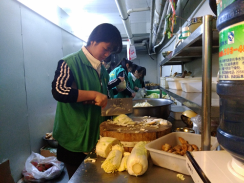志愿者正在后厨帮忙洗菜、切菜