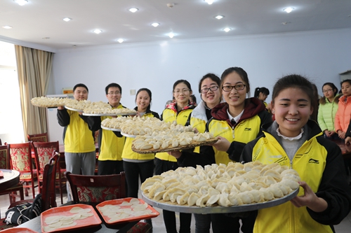 志愿者们和老人一起包饺子