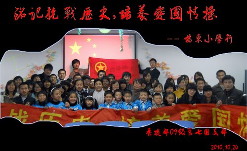 为纪念抗战胜利65周年,10月24日基础部09级第七团支部与承德市桥东小学共同举办了以“铭记抗战历史,培养爱国情操”为主题的团日活动。学校基础部党总支副书记梅爱敏,党支部书记彭援朝出席了本次活动。