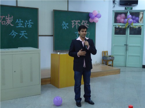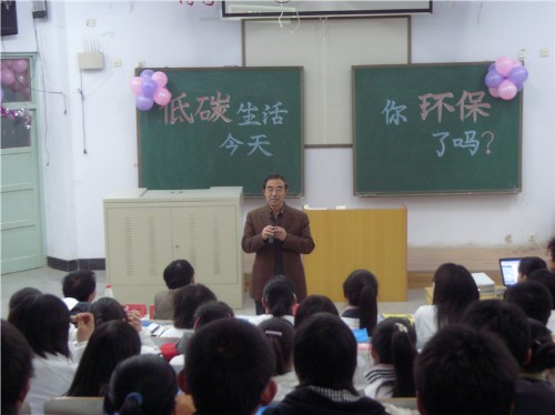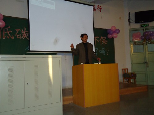 丁处长为大家讲解低碳和环保之间的关系以及绿化的作用,并用具体的数字说明碳过量的危害,突出了环境保护势在必行的紧迫性。手工社成员用以身边的废弃物为原料制成的精致实用的工艺品,向大家展示低碳环保理念在现实生活中的应用,别出心裁,引起了同学们对“低碳环保”理念的共鸣。接下来,该团支部同学和留学生共同带来了一场环保主题的文艺演出。诗朗诵《行动起来,保护环境》,铿锵有力,发人深省;留学生常亮结合自己留学经历,向观众作了精彩演讲,表达出自己对中国这片热土的热爱,并呼吁大家携手共建美好校园;中文歌曲《朋友》和巴基斯坦舞蹈等节目精彩纷呈,使大家在欢乐的氛围中将低碳环保铭记于心。最后,党委副书记王振方对活动做了精彩总结,对本次活动的意义给予肯定,并号召大家为建立环境友好、资源节约型社会而努力。