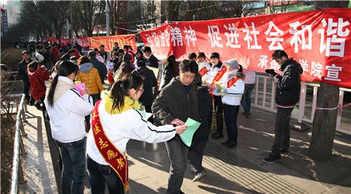 今年是实施“五五”普法规划的检查验收年,也是“12.4”全国法制宣传日确立十周年。在12.4法制宣传日来临之际,学校党委宣传部组织基础部09级第九团支部来到承德中心广场举办以“弘扬法治精神 促进社会和谐”为主题的法制宣传活动。