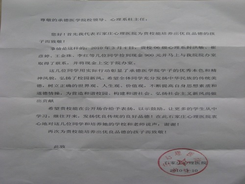 2010年3月2日,在石家庄心理医院实习的心理学系2006级应用心理班学生封洪敏、崔彦婷、李宏等几名同学在外出时捡到现金900元,他们立即把钱上交医院院办室,并请求医院协助查找失主。院方高度赞扬我校学生拾金不昧的行为并寄来表扬信,对我校给予学生的良好培养表示赞赏,并希望更多的学生能够继续发扬优良传统,彰显良好品德!