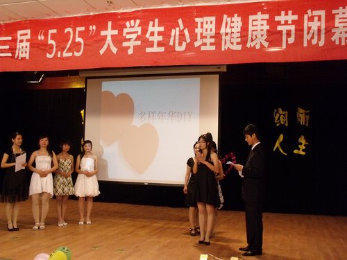 闭幕式通过颁奖及获奖作品展播,穿插文艺节目的形式,带领大家重温健康节期间的系列精彩活动。获奖漫画作品《心理防御机制》、《小和尚的大智慧》、《舆论》等把心理学知识用形象的方式展现给了大家;获奖DV作品《成长》让大家看到了一位大学生由迷茫堕落到奋发进取的过程,也给了广大同学心灵的启迪。“多样年华DIY”的结果展示掀起了闭幕式的高潮:从我校自愿报名的学生中选出的6名“灰姑娘”通过参加心理学系为她们精心设计的为期一周的活动,外在和内在都有了很大的变化,当她们以走秀的形式登上舞台的时候,引起了很大的轰动,并且她们也表示自信了很多。闭幕式中穿插的健美操、民族舞、小合唱等又增添了活跃的元素。在闭幕式的最后,参加活动的学生代表发言让大家真实体会了心理健康节的积极效果,她说道:“以前我喜欢把什么事情都憋在心里,但参加了几次活动,我可以打开心扉,现在我越来越被同学们欢迎。”