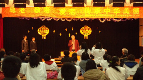 10月30日,该团支部组织同学们到承德市大学城(承德石油大学、承德民族师范大学、承德旅游学院)向大学生普及和宣传尊老敬老观念,并请同学们在条幅上签字。11月1日下午2点组织全班同学到承德市老年大学,通过为老人们打扫卫生和陪老人聊天下棋的方式给那里的老人送去温暖。11月4日上午10:00在8楼多功能厅,承德市老年大学、承德医学院老干部处联合10级中西医第一团支部一同举行大型文艺汇演,同学们献上了精心准备的文艺节目,原蚕桑研究所所长、研究员王军所长,原外语教研室于广达教授等众多老干部出席观看了汇演。