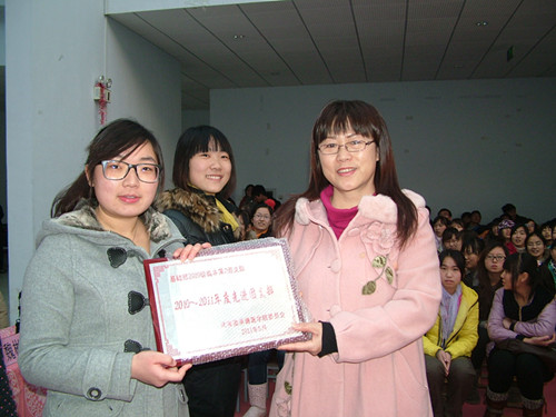 表彰大会由基础部2009级辅导员丁宁老师主持,梅爱敏副书记首先宣读了对8个毽球比赛获奖班级,5个最佳团日、2个十杰团日获奖团支部,3个先进团支部,1个五四红旗团支部,8个优秀志愿者服务队,16个文明宿舍以及29名学习进步奖、19名好人好事获奖个人的表彰决定。在激昂的音乐声中,与会领导老师依次为获奖的班级代表和获奖个人颁奖。颁奖结束后,09级临本1班张弛同学和09级临本6班张聪同学分别代表获奖班集体和获奖个人发言。