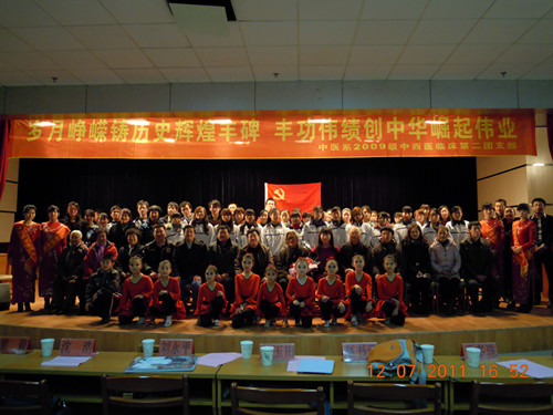 为庆祝中国共产党建党90周年、中华人民共和国成立62周年、中国第十二个五年计划的开局之年,中医系09级第二团支部于12 月7日下午3:30,在图书馆八楼多功能厅开展了以“岁月峥嵘铸历史辉煌丰碑,丰功伟绩创中华崛起伟业”为主题的团日活动。