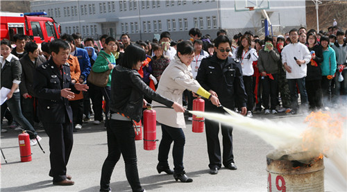 为了让师生真切体验火灾时如何自救和逃生,消防官兵在学生14号宿舍楼二楼模拟火灾现场,四百余名师生接到火警信号后,紧张有序地由宿舍楼安全通道撤离。承德市消防支队开发区中队指导员高阳带领消防队员在一旁对大家进行专业指导,保证模拟训练中师生的安全。随后,消防官兵又为大家模拟了坠窗逃生法,并分组对师生进行捆绑自救工具的培训。之后,我校保卫处治安科刘卫东科长和消防科布延平科长向师生们详细讲解了如何使用干粉灭火器,并由几位教师和同学进行了实际的灭火操作。