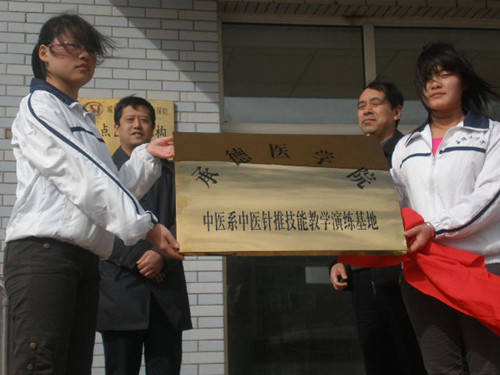 为更好地完成教学任务,提高学生实践能力,帮助学生加强对中医针推技能的感性认知,推动中医系的长足发展,经主管领导和相关部门负责人的同意,中医系于2011年4月8日,在学校肛肠医院建立“中医针灸推拿技能教学演练基地”。校医院院长郭洪杰、中医系党总支书记梁广和、中医系教学基地负责老师以及近100名针灸推拿专业学生参加了此次活动。