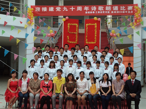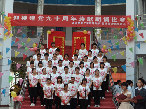 6月1日下午4:00,基础部09 级全体师生与基础部教工第四党支部共同举办的“迎接建党90周年诗歌朗诵比赛”在大学生活动中心举行。基础部党总支副书记梅爱敏、基础部教工第四党支部书记杜娈英、年级专兼职辅导员老师以及基础部09 级全体同学一同观看了此次比赛。