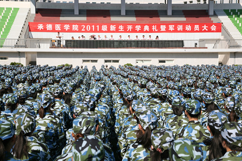 承德医学院2011级新生开学典礼暨军训动员大会于2011年9月5日在学校体育场隆重召开,学校党委书记刘永平、学校校长张树峰、学校党委副书记、大学生军训团政委王振方、学校党委副书记、军训团团长张东旭、学校副校长宋鸿儒、学校纪委书记张亚平、学校副校长谢利德、党委常委、组织部长朱伟民、党委常委、宣传部长赵书云和66028部队领导出席了大会,2011级全体新生和66028部队军训教官参加了大会,大会由学校办公室副主任安文忠主持。
