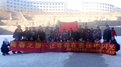 2012年11月14日上午,中医系2011级中西医第一团支部举办了团日活动:“青春之旅――让青春在责任中闪光”的第一站――责任之旅。支部的同学们在校园里进行了除雪铲冰活动,为承德医学院的师生开辟了安全、干净的通道。