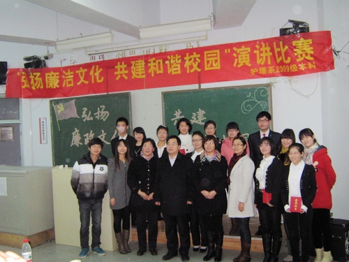 近日,党的十八大胜利召开,为积极响应胡锦涛主席提出的干部清正、政府清廉、政治清明的要求,学习践行廉政文化,护理系2009级本科全体学生在年级辅导员晏凤春老师的组织下,于11月14日下午在教学楼106教室开展了主题为“弘扬廉政文化 共建和谐校园”的演讲比赛。物资管理处处长李英平、学校纪检委副书记张淑玲、护理系党总支副书记王瑞婷、年级辅导员老师晏凤春以及学生代表乜腾蛟作为评委参加了此次活动。