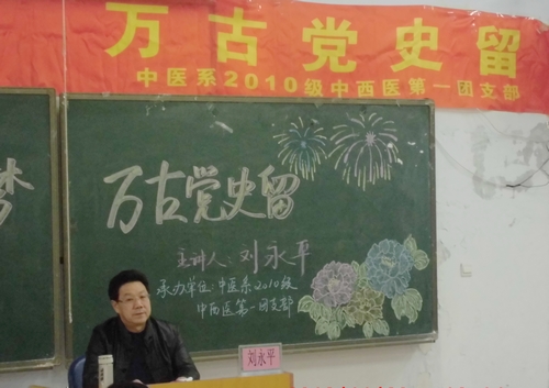 值十八大胜利闭幕之际,11月20 日下午,中医系2010级中西医第一团支部在教学楼209教室,举办了以“一心强国梦,万古党史留”为主题的团日活动。学校党委书记刘永平、团委书记沈浩、党委组织部王阳老师、党委宣传部范萌老师、中医系各位辅导员老师以及百余名学生参加了本次活动。