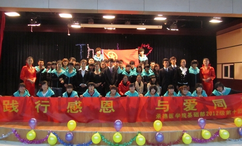 2012年11月23日,基础部2012级临本第十团支部在图书馆八楼多功能厅举办了以“践行感恩与爱同行”为主题的团日活动。承德医学院附属医院团委书记孙健、张国民老师、冯佩明老师、我校社科部艺术教育教研室主任修俊雅、教务处教学质量管理科副科长张泓波、基础部2012级辅导员韩素华、张静敏老师及学校近300名学生参加了此次活动。