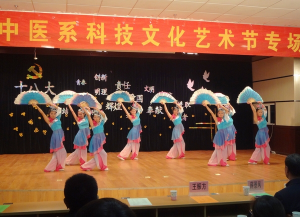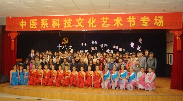 中医系专场演出是为迎接党的十八大、配合学校第十五届科技文化艺术节而开展的有中医系特色的文艺汇演。节目形式新颖独特,内容丰富多样。民族舞《伴君常开花一朵》以轻缓的音律、婀娜的步调拉开了整场演出的大幕;现代舞《绯女孩》欢快动感;《映山红》用大红色调的舞蹈服饰冲击观众视觉、用动感热烈的舞蹈动作展示了火红瑰丽的青春,映衬了“喜迎十八大”的主题。与此同时,语言类节目也是大放异彩,逼真的道具设计,幽默的台词独白无不让人捧腹称奇。值得一提的是,中医系的领导老师积极参加节目演出,为十八大献礼,为中医系添彩。2012级年级辅导员吴雪艳老师演唱经典歌曲《因为爱情》,婉转的歌喉令人陶醉;由中医系李晓杰副书记带领中医系辅导员参演的健美操《花枝招展》以娴熟的动作,较强的舞台表现力赢得全场最热烈的掌声。最后,中医系学生分会各位主席、部长共同唱响歌曲《相亲相爱》,极富感染力,全场齐唱。