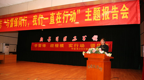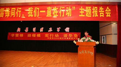 为深入贯彻雷锋精神,加快建设和谐校园、和谐社会的步伐,3月22日下午三点三十分,中医系2009级针灸推拿团支部在学校多功能厅举行“学雷锋 迎楷模 实行动 谱华章”主题团日活动。承德市精神文明办副主任李志强、承德医学院党委副书记张东旭、党委常委宣传部部长赵书云、学生工作部部长于多珠、宣传部副部长于淑华、中医系党总支副书记李晓杰等领导老师以及本次报告会的报告人承德市承钢集团鲍守坤同志莅临活动现场。
