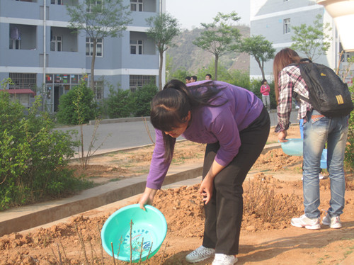 细心为新栽下的小树苗浇水 在宿舍楼前合影 | ||||||||