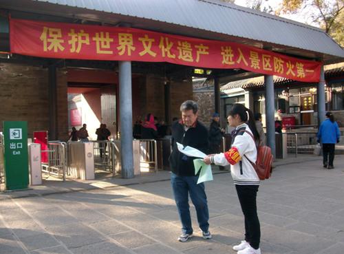 承德避暑山庄中山区面积占78%,林区植被茂盛,冬季防火任务十分艰巨。作为当代大学生,有责任向市民、游客宣传防火工作的重要性,营造人人热爱山庄,人人保护山庄的良好氛围。