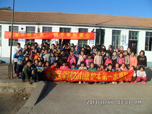 为了帮助小东沟村小学的贫困儿童解决基本的生活问题,提高他们学习环境的质量,发扬志愿者“奉献、友爱、互助、进步”的精神,2013年11月14日,护理学院2011级本科第一青年志愿服务队在小东沟村小学举办了以“关注贫困儿童 携手奉献爱心”为主题的志愿者活动。志愿者服务队为小东沟村的贫困儿童带去了体育器材、学习用品、生活用品等,志愿者们还为小学生补习功课、与小学生做游戏,让他们感受到了关爱与帮助,此次活动还体现了我校大学生乐于助人的风采。、