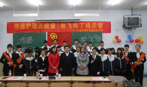 护理学院2012级护理本科第三团支部于2013年12月8日下午在教学楼107教室举办了“传递护理正能量,放飞南丁格尔梦”主题团日活动。团日活动邀请到了我校党委书记刘永平为全体团员做“中国梦与南丁格尔梦”讲座,护理学院党总支书记王瑞婷、护理学院2012级辅导员齐菲老师以及护理学院2012级护理本科一大班全体团员参加了本次团日活动。