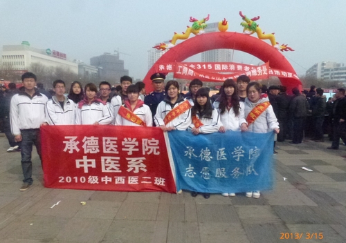 为认真学习贯彻和落实十八大精神,积极响应党中央的号召,切实在创新消费维权理念和深化消费教育上下功夫,应承德医学院团委、青年志愿者协会的号召,中医系2010级中西医第二志愿者服务队于2013年3月15日在中心广场联合承德市双桥区消费者协会开展了以“创新消费维权理念、增强消费保护意识”为主题的志愿者活动。