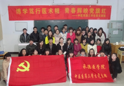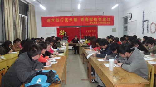为响应学校党委学习两会精神的号召,3月16日,值两会圆满结束之际,中医系第三学生党支部在中医系党总支的指导下,在实验楼125 教室,开展了以“学习十八大与两会精髓,始终保持先进思想”为主题的系列学习活动。