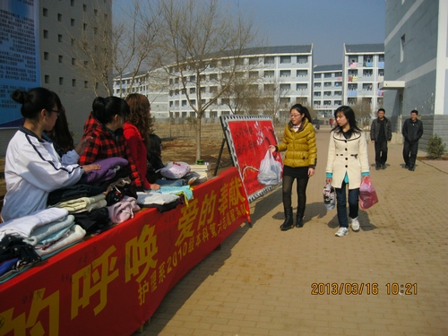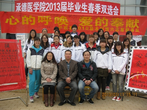 今年是毛泽东同志发表“向雷锋同志学习”题词50周年;同时,今年3月5日也是我国第14个青年志愿者服务日。为传承雷锋精神,倡导“奉献、友爱、互助、进步”的志愿服务精神,3月16日、17日,护理系2010级本科第六志愿服务队在大学生活动中心前举办了以“心的呼唤爱的奉献”为主题的募捐活动,承德市救助管理站书记冯树岭和英语教研室张燕霞老师参加了活动。冯书记表示,希望和该服务队能够达成长期的合作关系,共同来帮助贫困山区的孩子。