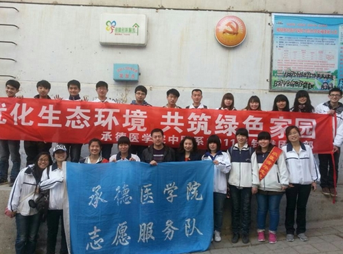 2013年3月25日,承德医学院中医系2011级针灸推拿志愿者服务队成功举办了主题为“优化生态环境,共筑绿色家园 ”的志愿者活动。