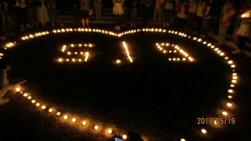 5月19日是“世界艾滋病烛光纪念日” 又是距雅安地震近一个月的日子,大学生红丝带协会在图书馆后天桥旁十字路口成功举办了“承德医学院首届大型烛光纪念活动”, 1000多名学生参加了此次活动。