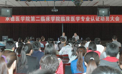 根据我校2013年临床医学专业认证工作的总体部署和要求, 2013年5月21日下午,承德医学院第二临床学院临床医学专业认证动员大会在中心医院多功能厅召开。临床学院2009级临本三大班全体同学参加了大会。大会由我校副校长唐世英主讲,学生处处长于多珠主持会议。