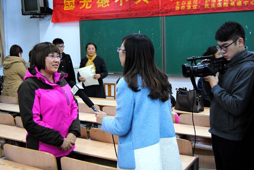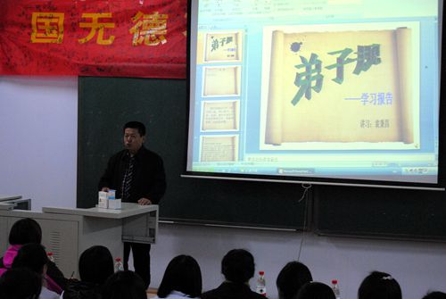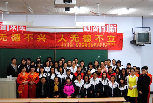 2014年10月30日,我校护理学院2012级本科第六团支部在教学楼108教室举办了以“国无德不兴 人无德不立”为主题的团日活动。其目的是教导学生努力提高道德修养和道德水平,将来按照道德原则为人处世。承德市爱心联盟志愿者协会会长杨艳、民生保险承德中心支公司副总经理袁秉昌、我校社科部艺术教研室修俊雅老师,同时还有远道而来的义工老师和承德电视台的工作人员等参加了活动。 袁老师进行《弟子规》讲座 电视台的记者在采访杨艳会长 全体合影留念 编辑:周文娟、范萌 摄影:项航