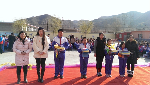 抵达小学后,志愿者们走进课堂,分别为小学生们上了一堂生动的音乐课与美术课。下课后,文艺汇演正式拉开序幕,施曼老师、社联主席张晶和鲍守坤分别进行了讲话,真挚的话语表达了对陈栅子中心小学师生的深切关心与衷心祝愿。精彩的节目相继登场,深情的歌声让人陶醉其中,感动不已;小学生动感十足的舞蹈,热情洋溢,跃动的节拍,整齐的动作,赢得了观众们的阵阵掌声。红丝带协会与鲍守坤爱心团队向学生代表发放文具和跳绳等,感动了现场观众,也让大家深刻体会到了“大手拉小手,这个冬天不太冷”的温暖。最后王继用校长做了总结发言,他表达了对我校团委、社联大学生红丝带协会和鲍守坤爱心团队的感谢及对陈栅子小学未来的美好希冀。