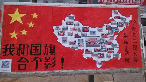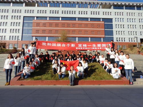 为庆祝建国65周年,激发全民爱国热情,2014年11月15日,基础医学院2013级第三团支部在学生处副处长张文军、基础医学院2013级年级辅导员李庆林老师的指导下,举办了以“我和国旗合个影 定格一生爱国情”为主题的团日活动。