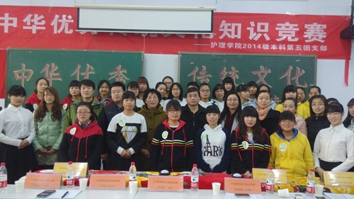 为弘扬中华优秀传统文化,提高优秀传统文化的影响力、竞争力,护理学院2014级本科第五团支部主办,护理学院2014级其他团支部协办的“中华优秀传统文化知识竞赛”活动,于2014年11月23日上午在教学楼210教室举行。护理学院书记王瑞婷、学生处副处长张文军、纪检委正科级纪检员马春虎、校团委副书记白江涛、社科部赵兵、2014级辅导员晏凤春、徐萌泽等出席了本次活动。2014级护理本科学生150余人参加了活动。