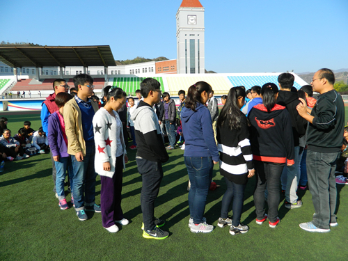 2015年10月18日,基础医学院2015级全体同学在学校操场开展了团体辅导活动。活动分三组分别开展不同的户外拓展内容。本次活动由学生处学生科科长、基础医学院2015级兼职辅导员老师翟冰峰,基础医学院2015级辅导员老师钟蒙辛和姜力力组织筹划。 上午9点,第一组学生整队入场。首先进行的是热身游戏――“人椅”,然后一起拍掌喊口号“我们是基础医学院2015级最棒的”。之后又进行了“解手环”游戏。下午第二组学生和第三组分别整队入场,整个团体辅导流程与第一组相同,更换了拓展内容,老师寓教于乐,学生受益匪浅,整场活动氛围融洽。 在每一组团体活动最后,老师都针对活动进行总结。参加活动的学生都表示通过团体辅导活动,同学之间关系更加融洽了,配合更加默契了,归属感更加强烈了。