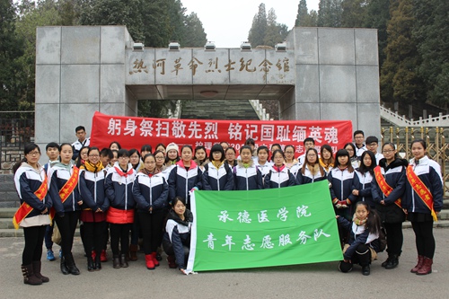 2015年11月14日,为了坚定反对侵略战争、捍卫人类尊严、维护世界和平的立场,护理学院2012级本科第五青年志愿者服务队在热河革命烈士纪念馆举办以“躬身祭扫敬先烈 铭记国耻缅英魂”为主题活动。
