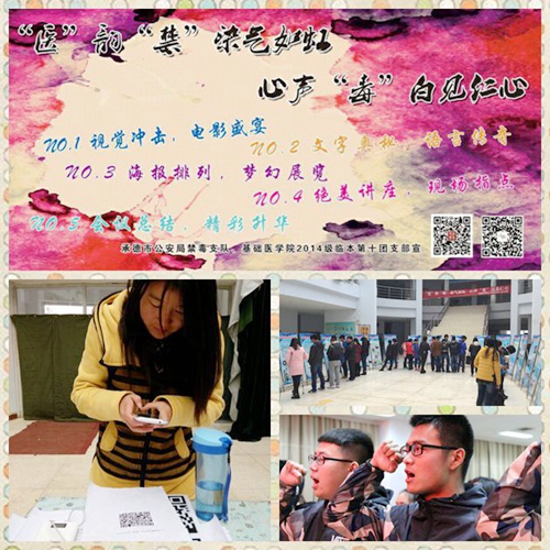 2015年11月3日到25日,为深入贯彻落实党中央对禁毒工作的重要指示,积极响应河北省禁毒办、河北省教育厅号召,进一步增强对青少年毒品预防教育的针对性和实效性,切实提高青年学生识毒、防毒、拒毒的意识和能力,基础医学院2014级临本第十团支部开展了以“‘医’韵‘禁’染气如虹 心声‘毒’白见仁心”为主题的团日活动。11月25日下午,该团支部于图书馆八楼多功能厅开展禁毒讲座。承德市公安局禁毒支队政委朱东风、禁毒支队科长庞爱忠、双桥区公安局禁毒大队教员张晓明、共青团市委学少部部长赵淑芬、副部长张大磊、学校宣传统战部部长于多珠、安全工作处副处长马超、团委副书记白江涛、基础医学院党总支书记杨凤国、副书记李欣,艺术教育教研室老师修俊雅、军事教研室老师马严、基础医学院2014级辅导员祁延伟、丁宁、周泽,以及全校近300名同学参加此次活动。 活动在嘹亮的团歌声中拉开帷幕。首先,承德市公安局禁毒支队政委朱东风同志上台进行讲座。他从毒品的种类、危害、以及如何防吸第一口等方面做了精彩讲解。讲座中穿插的毒品展示环节,将全场的气氛推向高潮。生动的禁毒宣传片将识毒拒毒的意义完美诠释。随后,诗朗诵《罂粟荒城》,悲怆的氛围中体现了毒品的危害,“请乘健康之马,挥鞭从此起程;路上春色正好,天上太阳正晴!”伴随着热烈掌声的庄严宣誓,同学们将远离毒品的誓言铭记于心。小品《外卖奇遇记》以幽默诙谐的语言和故事情节又一次强调了识毒防毒拒毒的重要性。活动最后,于多珠总结发言。他表示当代大学生要做知法懂法守法好青年,此次活动是一个窗口,吸毒制毒贩毒不仅对自身有危害,对社会、对国家的发展都有负面影响。希望广大同学洁身自律,绝不尝试第一口。 此次活动积极落实“五个一”行动,即观看一部禁毒影片,开展一次禁毒征文比赛,参观一次禁毒展览,组织一次禁毒讲座,开展一次主题班会。11月3日,该团支部面向全校同学播放了电影《毒战》,将识毒、防毒、拒毒的观念深入人心。在以“文字奥秘语言传奇”为主题的禁毒征文活动中,同学们的积极参与让“拒绝毒品”的概念进一步升华。禁毒知识海报展览活动于11月8日-10日在我校大学生活动中心一楼大厅顺利举行,同学们纷纷扫描河北省禁毒微信二维码,关注该平台,了解禁毒知识。在主题班会中,禁毒宣传片生动形象地进一步宣传了毒品的危害。 通过此次系列活动的开展,广大青年不仅学习到禁毒的法律法规,而且医学生将以医学知识宣传识毒、防毒、拒毒的方法,让更多的人受益。 承德广播电视台今日聚焦节目对此次活动进行了全程跟踪报道。