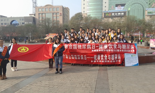 2015年11月14日,为推动国际糖尿病防治事业的开展,护理学院2012级本科第四团支部联合承德市疾病预防控制中心于“世界糖尿病日”,在校园和承德市中心广场开展以“第9个联合国糖尿病日――健康饮食与糖尿病”为主题的团日活动。承德市疾病预防控制中心老师和护理学院2012级本科年级辅导员黄莹参加了本次活动。 上午,全体团员于承德市中心广场向广大群众宣传“应对糖尿病,立即行动”,对过往的路人进行糖尿病知识的讲解。下午,全体成员在教学楼406教室打团旗、唱团歌,交流本次活动的学习体验与心得。 本次活动的开展,提高了社会对糖尿病防治的观念和意识,培养了团支部团员的团队精神,增强了集体的凝聚力。