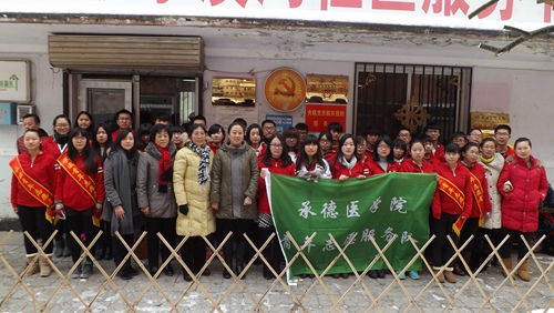2015年11月27日上午,基础医学院2015级临本第八青年志愿者服务队在小溪沟社区开展以“承医情 医者心”为主题的青年志愿者活动。承德市小溪沟社区党总支书记、主任盛育蕊,社科部教授修俊雅,基础医学院2015级党支部书记韩素华,生理教研室老师王闯,基础医学院2015级辅导员老师姜力力出席此次活动,该青年志愿者服务队全体志愿者及社区部分居民参与本次活动。