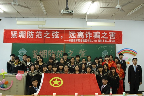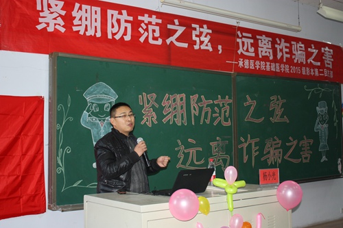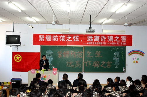 2015年12月4日,为给大学生普及防诈骗知识,提高广大学生安全防范意识,我校安全工作处与基础医学院2015级影本第二团支部共同开展了以“紧绷防范之弦,远离诈骗之害”为主题的安全宣讲活动。承德市双桥区狮子沟镇派出所民警杨小光、鲍世杰、巴海洋,我校安全工作处治安科科长戴杰、办公室副主任杨济维、治安科老师王佳萍,基础医学院2015级辅导员姜力力、钟蒙辛出席了此次活动。该团支部全体团员参加了此次活动。