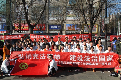 2015年12月4日,在国家宪法日到来之际,为响应国家号召,学习、传承、发扬习近平总书记重要讲话精神,把“宪法精神”这一理念切实结合到人民生活当中,我校法制工作办公室与基础医学院2015级临本第一团支部于承德市中心广场共同举办主题为“弘扬宪法精神,建设法治国家”的团日活动。党委宣传统战部部长于多珠,副部长周文娟,社科部教授修俊雅,法制工作办公室老师张颖、范萌,基础医学院2015级辅导员老师韩素华、姜力力、钟蒙辛以及该团支部全体团员参加了此次活动。
