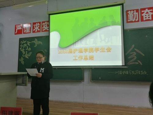 2016年10月21日中午,护理学院2017届学生分会成立大会在教学楼210教室召开。 护理学院党总支组织委员梁迎辉老师宣读了2017届学生分会成员名单,并对新一届学生会成员的加入表示热烈祝贺。 护理学院2016届学生分会主席曹文叶对上一年的工作进行了总结,以PPT展示的方式,从“组织建设”“活动开展”“硕果累累”“宣传新局面”四个方面,介绍了学生会的组织建设工作和各部门的特色活动,回忆了学生会在各项活动中取得的荣誉和成绩,并且表达了对新一届学生会的殷切希望。 2017届学生分会主席肖玥宣读年度工作计划,她表示新一届学生分会将继续秉承护理学院学生会团结创新的精神,大家拧成一股绳,努力做好各项工作,进一步扩大护理学院学生分会的影响力。 各部门部长对本部门新一年的工作提出具体的实施计划,各部长充满激情的发言也让全体成员对学生会的工作充满信心与热情! 护理学院党总支副书记田建丽对学生会寄语。田书记在对学生会提出的工作计划给予肯定和支持的同时,也表达了对学生会的美好希冀。她指出,护理学院学生分会有着优良的传统,并一届届传承着。学生分会在领导、老师及校学生会的指导下,在与各系部学生分会的交流与合作下,本着务实高效、锐意创新的精神,充分发挥“自我教育、自我管理、自我服务”的工作职能,取得了丰硕成果。作为新一届学生干部,一要强化政治理论学习,紧跟时代步伐,模范践行社会主义核心价值观,践行“从学生中来,到学生中去”的理念,特别是学生会的学生党员干部要充分发挥党员的先锋模范作用,结合“两学一做”学习教育,开展各项工作,起到标杆作用。二要全心全意服务同学,发挥桥梁纽带和润滑剂的作用。想同学所想,思同学所思,并结合护理专业特点开展有特色的活动,营造和谐向上的学习、工作氛围。三要模范遵守校纪校规,每一名学生会干部都应是遵纪守法、品学兼优的标兵。牢记使命,拼搏进取,相信2017届学生分会会继续发扬团结友爱精神,勇于创新,与时俱进,在新的一年实现更大的突破!听了田书记的讲话,学生会成员也纷纷表示一定不辜负领导、老师的期望,定当再创佳绩! 本次成立大会的圆满举办为护理学院学生分会工作的开展注入了新的活力,也对学生会成员提出了新的要求。作为学生干部,更应该坚定理想信念,树立社会主义核心价值观,积极做好榜样模范带头作用,让中国梦和我们学生会的青春梦在绚烂的年华里交相辉映,溢彩流光!